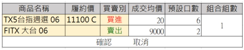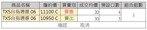 一次只能勾選兩個商品來做組合,若兩個商品都是選擇權商品,組合組數預設帶兩個商品最小口數,該欄位可供修改成最小口數以下之數值。