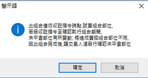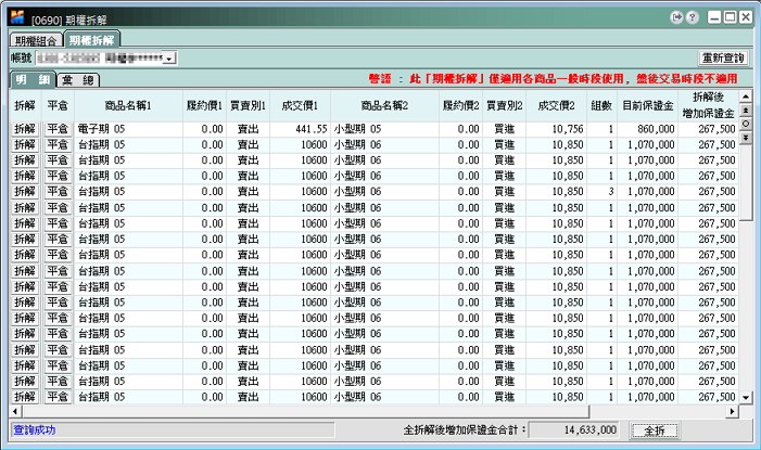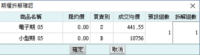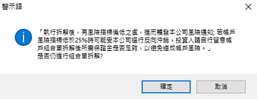 按下確認顯示警語視窗:此組合僅依收訖指令時點,試算組合部位,若自收訖指令至確認執行組合期間,未平倉部位有所變動,將造成實際組合部位不同,因此組合完成後,請交易人須自行確認未平倉部位。 按下取消回到MAP[期權組合拆解],按下執行組合進行送申請的動作。